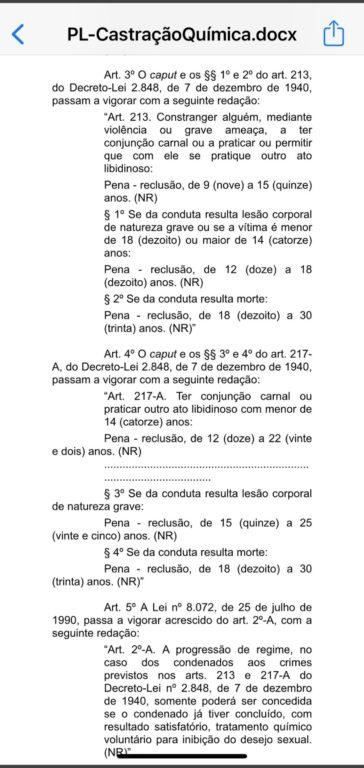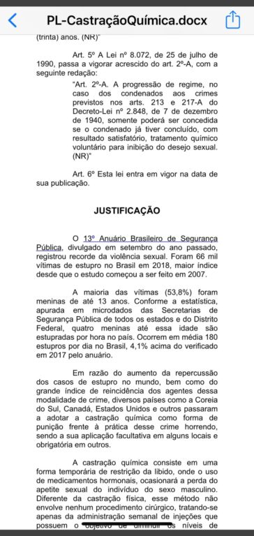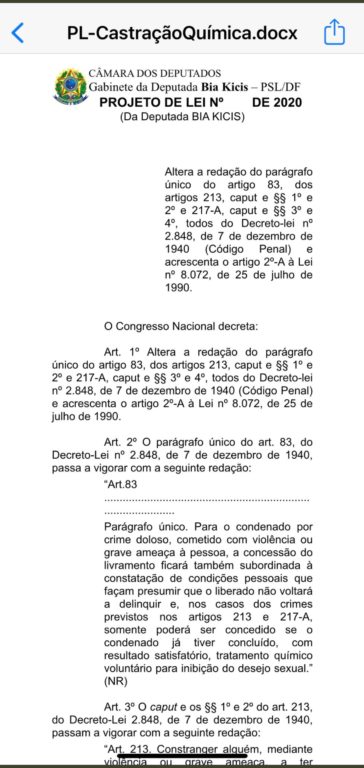 Sensível aos temas contemporâneos relevantes a deputada federal por Brasília Bia Kicis, apresentou Projeto de Lei junto à Câmara dos Deputados que obriga os condenados de estupro a passar por procedimento de castração química. Projeto esse que consiste em uma forma temporária da restrição da libido.