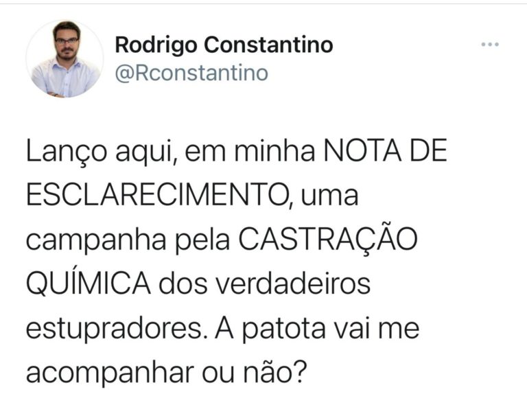 Vítima de uma verdadeira campanha de assassinato de reputação, Rodrigo Constantino desafiou a “patota” a aderir uma campanha para castração química de ‘verdadeiros’ estupradores.