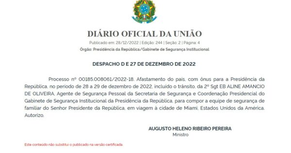 Em meio a essas informações, um despacho do Gabinete de Segurança Institucional (GSI) foi publicado no Diário Oficial da União (DOU) nesta quarta designando uma sargento do Exército “para compor a equipe de segurança de familiar do Senhor Presidente da República, em viagem à cidade de Miami”.