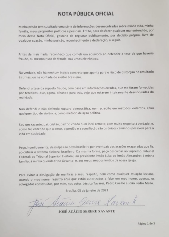 O cacique reconheceu ainda que errou ao defender a tese de risco de fraude nas urnas eletrônicas. Ele afirmou que encampou a narrativa com base em “informações erradas fornecidas por terceiros” e “inteiramente desvinculadas da realidade”.
