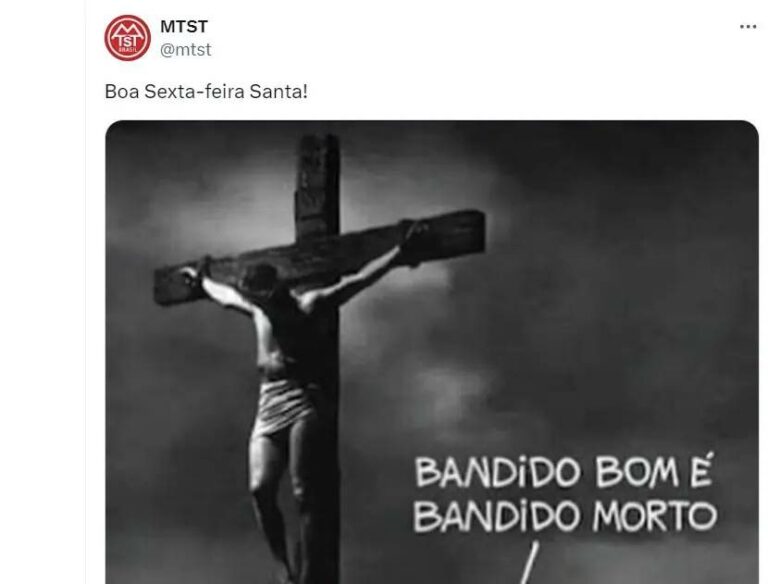 A publicação de uma foto de Jesus Cristo crucificado pelo Movimento dos Trabalhadores Sem Teto (MTST) gerou controvérsia nas redes sociais. A legenda da imagem continha a frase: “Bandido bom é Bandido Morto”. A postagem ocorreu nesta sexta-feira, 29, no Twitter/X.