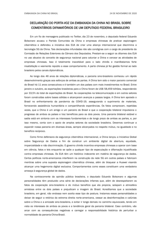 14) Na contracorrente da opinião pública brasileira, o dep. Eduardo Bolsonaro e algumas personalidades têm produzido uma série de declarações infames que, além de desrespeitarem os fatos da cooperação sino-brasileira e do mútuo benefício que ela propicia, …