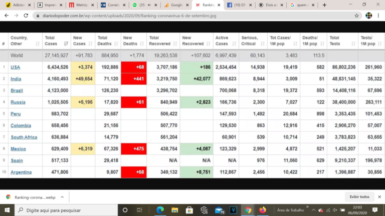 Entre os 10 primeiros, há seis países americanos (EUA, Brasil, Peru, Colômbia, México e Argentina), além de Índia, Rússia, África do Sul e Espanha.