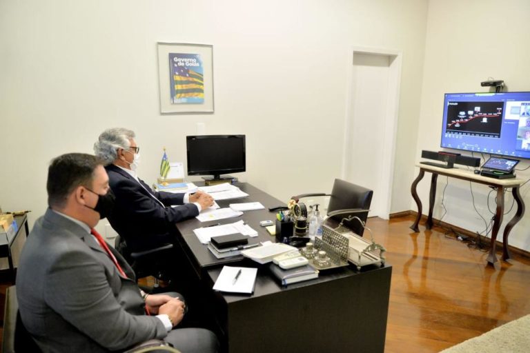 Legenda: Governador Ronaldo Caiado e secretário José Vitti participam de videoconferência em que Caoa anuncia expansão na produção de veículo com geração de mais 1.134 empregos diretos, em Anápolis