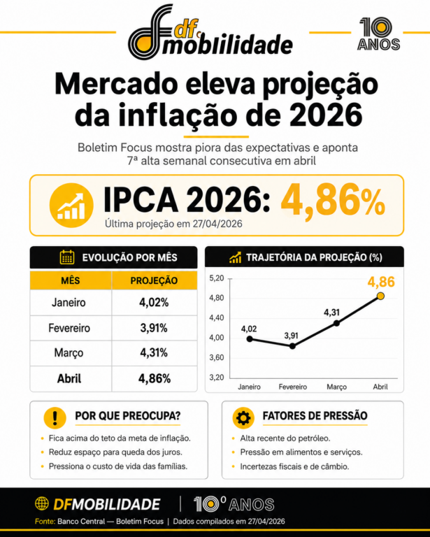 O mercado financeiro voltou a piorar a previsão para a inflação de 2026. Segundo o Boletim Focus divulgado nesta segunda-feira, 27 de abril de 2026, pelo Banco Central, a estimativa para o Índice Nacional de Preços ao Consumidor Amplo (IPCA) subiu de 4,80% para 4,86%. Foi a sétima alta consecutiva da projeção.