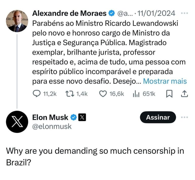 Na rede social X, um post feito pelo ministro do Supremo Tribunal Federal (STF), Alexandre de Moraes, há 3 meses, sobre Ricardo Lewandowski recebeu, hoje, a interação de ninguém menos que o dono da plataforma, Elon Musk, para questionar sobre o que considera autoritarismo de Moraes sobre o Brasil