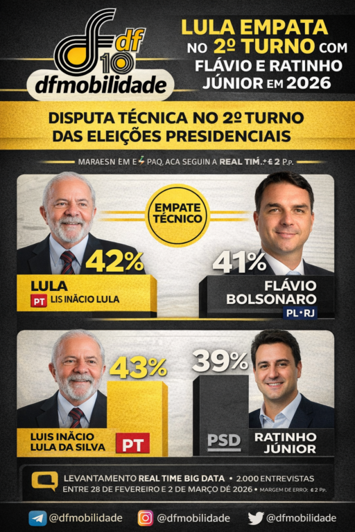 Levantamento nacional divulgado nesta terça-feira pela Real Time Big Data, com 2.000 entrevistas realizadas entre 28 de fevereiro e 2 de março de 2026, aponta que o presidente Luiz Inácio Lula da Silva (PT) e o senador Flávio Bolsonaro (PL-RJ) estão tecnicamente empatados em um eventual segundo turno das eleições presidenciais deste ano. Os números — à frente ou atrás por margem inferior à margem de erro de 2 pontos percentuais — mostram que a vantagem do petista não é estatisticamente consolidada na disputa direta com o representante da direita.