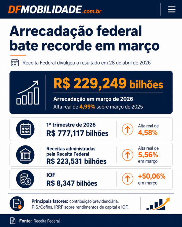 A arrecadação federal bateu recorde em março de 2026 e chegou a R$ 229,249 bilhões, segundo dados divulgados pela Receita Federal nesta terça-feira, 28 de abril de 2026. O resultado representa alta real de 4,99% em relação a março de 2025, já descontada a inflação pelo IPCA. Foi o melhor desempenho para o mês desde o início da série histórica considerada pela Receita.