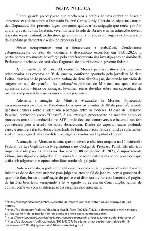 Parlamentares pedem que Alexandre de Moraes se declare suspeito e deixe a relatória dos inquéritos envolvendo o 8 de JaneiroSenadores da oposição publicaram, nesta sexta-feira 19, uma nota conjunta em defesa do deputado federal Carlos Jordy (PL), alvo da Operação Lesa Pátria, que investiga financiadores, incentivadores e executores dos atos antidemocráticos no País.