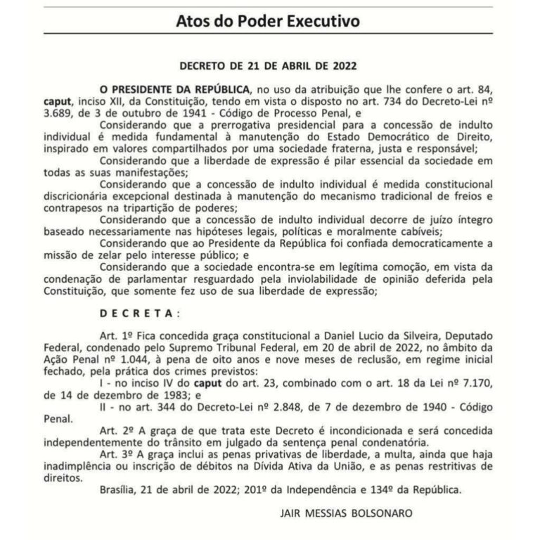 O presidente Jair Bolsonaro acaba de conceder Graça ao deputado federal Daniel Silveira, perdoando sua pena de mais de 8 anos de prisão.