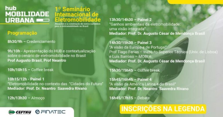 A Fundação de Empreendimentos Científicos e Tecnológicos (Finatec) será o cenário do 1º Seminário Internacional de Eletromobilidade em 17 de janeiro, focando na sustentabilidade no transporte e no avanço da eletromobilidade. Com eixos temáticos como “Eletromobilidade no contexto das ‘Cidades do Futuro'” e “Ganhos ambientais da eletromobilidade: uma visão integrada”, o evento, aberto ao público, requer inscrição antecipada no Sympla, com o credenciamento iniciando às 8h30.