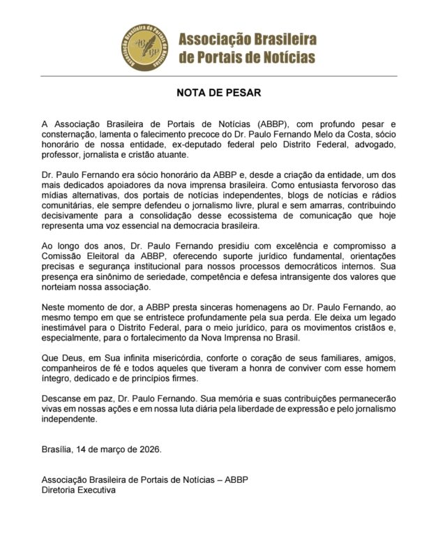 A Associação Brasileira de Portais de Notícias (ABBP) divulgou neste sábado (14) uma nota de pesar pelo falecimento do advogado, professor, jornalista e ex-deputado federal pelo Distrito Federal, Paulo Fernando Melo da Costa. Reconhecido por sua atuação firme na defesa da liberdade de expressão e da chamada nova imprensa, ele também era sócio honorário da entidade.