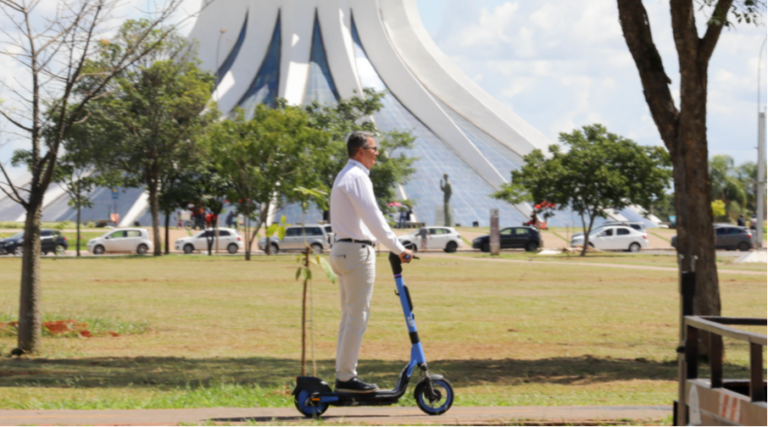 Patinetes elétricos, como esses em frente à Catedral, fazem parte da expansão da micromobilidade no DF. (Crédito: Agência Brasília)