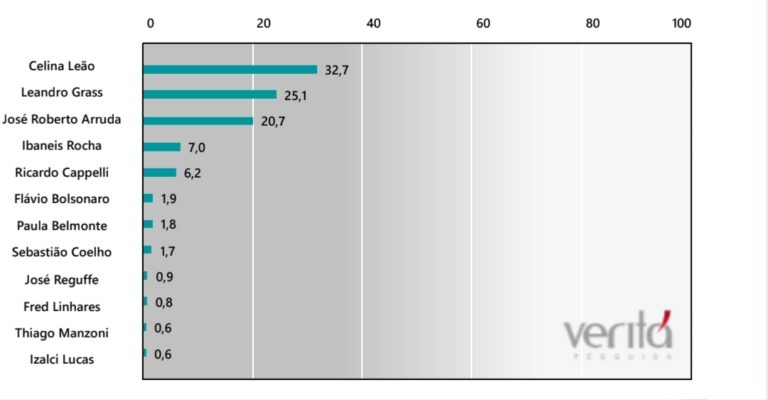 Na sequência, aparecem Leandro Grass, com 25,1%, e José Roberto Arruda, com 20,7%. Outros nomes, como Ricardo Cappelli e Paula Belmonte, surgem com índices menores, reforçando a dianteira confortável da atual vice-governadora.