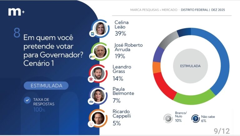 A vice-governadora Celina Leão aparece com ampla liderança na mais recente pesquisa de intenção de voto para o Governo do Distrito Federal, divulgada em dezembro de 2025. No cenário estimulado, Celina soma 39% das intenções, abrindo uma vantagem folgada sobre os demais concorrentes e consolidando-se como o principal nome na disputa.