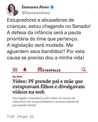 Após a noticia de que a Polícia Federal prendeu pai e mãe que estupravam filhos e divulgavam na Web, a senadora Damares Alves (Republicanos) ficou indignada e mandou recado aos abusadores de crianças.