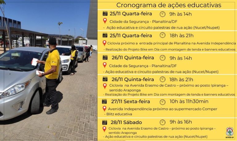 (Brasília, 24/11/2020) – Entre os dias 25 e 29 de novembro o Detran-DF realizará diversas ações de educação e fiscalização de trânsito em Planaltina. O órgão irá compor o projeto da Secretaria de Segurança Pública do Distrito Federal (SSP-DF): Cidade da Segurança Pública, que faz parte do programa DF mais Seguro. Planaltina será a primeira região administrativa a receber o projeto, por isso, as ações de trânsito serão intensificadas no local, com atuação conjunta do Detran, DER, PRF e PMDF, neste período.