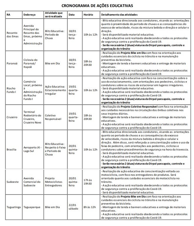 (Brasília, 17/1/2022) – No período de 18 a 22 de janeiro, a Diretoria de Educação de Trânsito do Detran-DF realizará ações educativas no Cruzeiro, Lago Sul, Paranoá, Recanto das Emas, Riacho Fundo I, Sudoeste e Taguatinga. Haverá atividades voltadas a ciclistas, motofretistas e condutores, confira a programação: