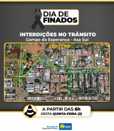 “O balão em frente ao cemitério estará parcialmente bloqueado. Haverá apenas duas saídas, à esquerda, para quem for seguir para a EPPM, e à direita, para quem seguir para o sentido norte. A via entre o cemitério e a EPPM estará em sentido único. Além disso, o Setor Policial está com obras em andamento, por isso ressaltamos a importância de estar atento ao trânsito”.