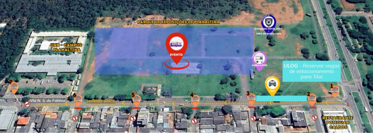 Em Planaltina, as ações de engenharia de tráfego começam mais cedo, organizando a chegada do público para o sétimo Festival ExpoMix Brasil, no Parque de Exposições, a partir das 14h de sexta-feira, a Via Nossa Senhora de Fátima passa a funcionar em sentido único, no trecho entre a Avenida Independência e o campus da Universidade de Brasília.