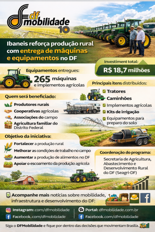 Além da entrega das máquinas, o governo citou outras iniciativas voltadas ao desenvolvimento rural, como a regularização de propriedades, pavimentação de vias rurais e programas de apoio à produção, medidas que buscam fortalecer o chamado cinturão agrícola de Brasília e melhorar o escoamento da produção.