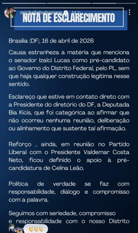 Em suas redes sociais, Michelle foi direta ao afirmar que a pré-candidatura não foi discutida nem alinhada com as principais lideranças do partido. Segundo ela, conversas com a deputada Bia Kicis e com o presidente nacional do PL, Valdemar Costa Neto, reforçam que o direcionamento da sigla no DF caminha em outra direção.