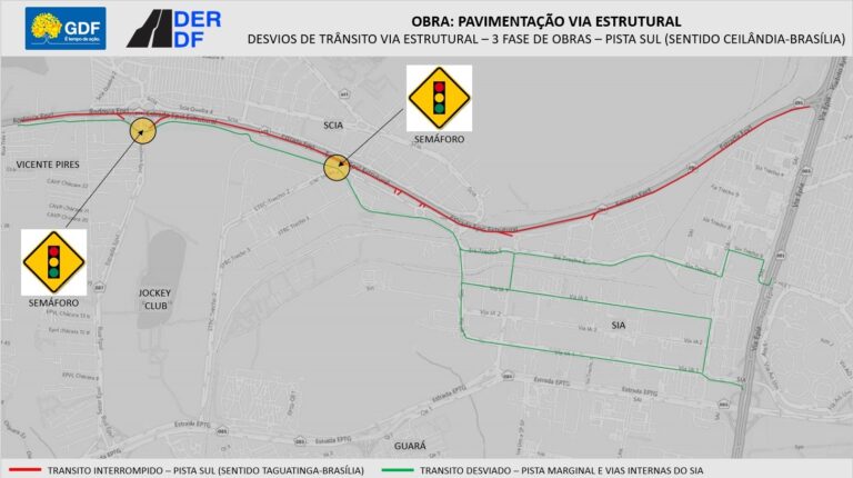 Com isso, os motoristas vão seguir pela via marginal do lado sul da rodovia e terão como alternativa de trânsito prosseguir pelas vias internas do Setor de Indústria e Abastecimento (SIA), seja em direção à Feira dos Importados, em direção aos trechos 2, 3 e 4, seja em direção à Estrada Parque Indústria e Abastecimento (Epia).