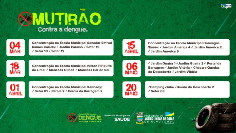 A Prefeitura Municipal de Águas Lindas, por meio da Secretaria de Saúde e Vigilância em Saúde, realizará uma campanha de conscientização de combate à dengue. A ação terá início no dia 04 de março, e passará por diversos bairros do município, o objetivo da campanha é alertar a população sobre a importância de combater a proliferação do mosquito transmissor da doença, especialmente nessa época do ano, marcada por fortes chuvas que criam condições ideais para a reprodução do Aedes aegypti.