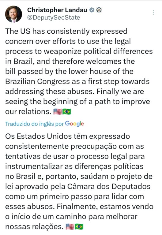 Em nota divulgada em sua conta oficial, Landau afirmou que Washington “expressou consistentemente preocupação” com tentativas de “instrumentalizar diferenças políticas por meio do Judiciário” no Brasil. Ele classificou a aprovação do texto pela Câmara como “um primeiro passo” para enfrentar esses abusos e como sinal de que um caminho de recomposição das relações bilaterais começa a se formar.