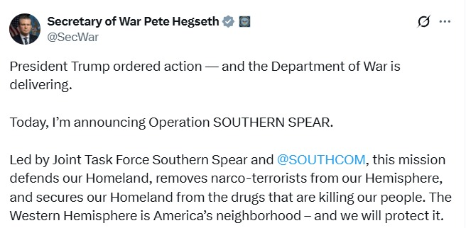 O secretário de Guerra dos Estados Unidos, Pete Hegseth, anunciou nesta quarta-feira a Operação Southern Spear, iniciativa militar autorizada pelo presidente Donald Trump e conduzida pelo Comando Sul (SOUTHCOM). A medida marca uma nova fase da política externa e de segurança do governo, que intensifica ações diretas contra redes de narcotráfico consideradas estratégicas na região.