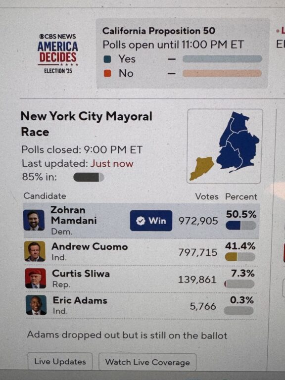 Zohra Mamdani, do Partido Democrata, foi declarado vencedor da disputa pela prefeitura de Nova York, segundo a apuração divulgada pela CBS News com 85% das urnas apuradas. Com 50,5% dos votos, Mamdani superou nomes políticos de forte expressão na cidade, como Andrew Cuomo, que concorreu como independente e obteve 41,4%, e Curtis Sliwa, representante do Partido Republicano, que somou 7,3%. Eric Adams, ex-prefeito, ainda constou na cédula, mas não manteve campanha ativa, registrando apenas 0,3%.