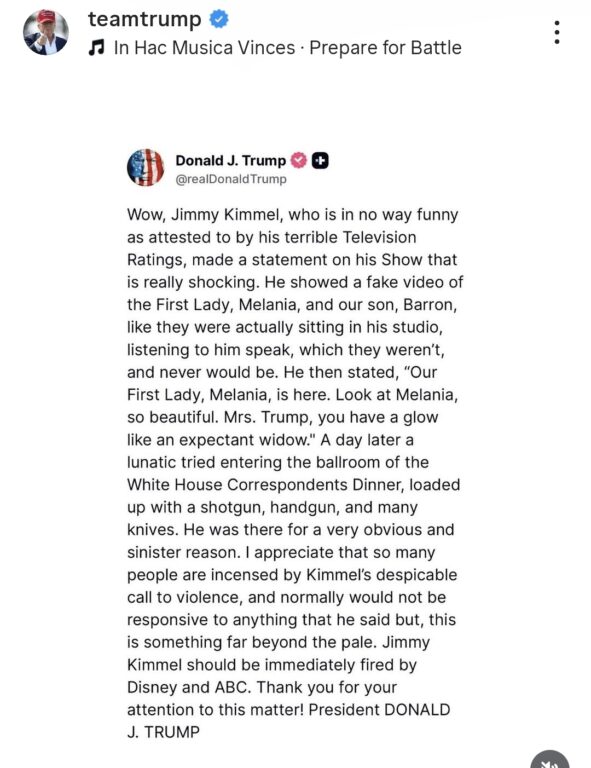 No print atribuído ao perfil Team Trump, aparece uma publicação de Donald Trump criticando duramente Kimmel. O presidente afirma que o apresentador exibiu um vídeo falso com Melania e Barron Trump como se estivessem no estúdio e, em seguida, teria dito que a primeira-dama estava “com brilho de viúva expectante”. A frase foi tratada por Trump como uma insinuação grave e uma ultrapassagem dos limites do humor político.