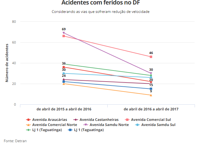 O número de acidentes com feridos no Distrito Federal caiu 35,9% nas oito avenidas nas quais o Departamento de Trânsito (Detran) aplicou redução de velocidade.