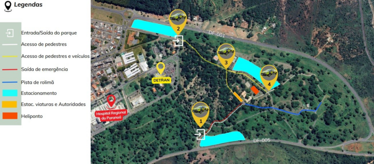 As equipes de trânsito organizarão as áreas de estacionamento no gramado externo e garantirão uma rota de escape livre para veículos de emergência.