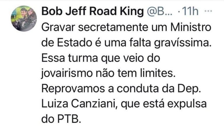 Na publicação feita pelo “manda chuva” do PTB Bob Jef  escerveu : “Reprovamos a conduta a deputada Luísa Canziani, que está expulsa do PTB”