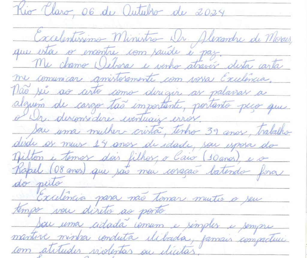 Em carta a Moraes, Débora pede desculpas por “ato desprezível” e que “filhos choram todos os dias”